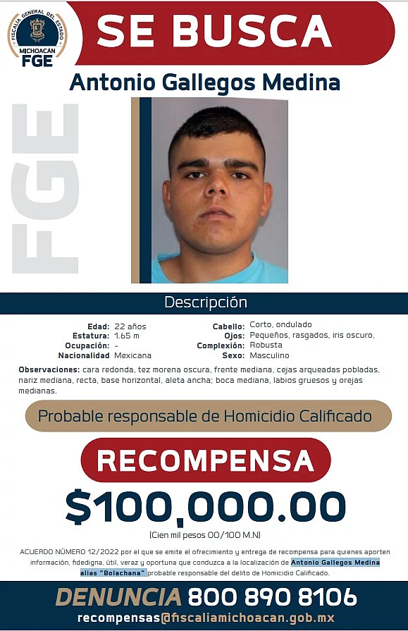 Asimismo, se ofrece recompensa por Antonio Gallegos Medina, alias “Bolachana”: