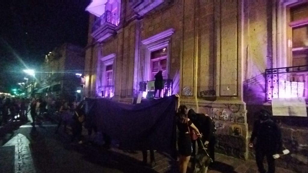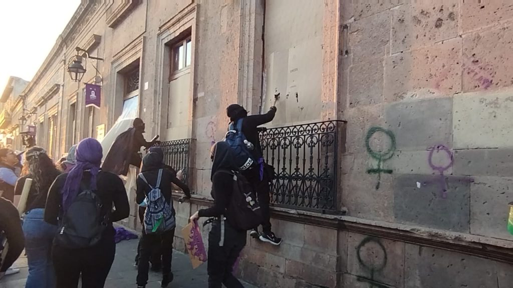 La marcha siguió hasta llegar al Congreso del estado, donde los ánimos se caldearon aún más; las mismas mujeres vestidas de negro quebraron los cristales de las ventanas del edificio histórico y pintaron prácticamente toda la fachada principal..
